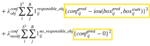 - 책임 BBox에 대해서 예측된 Object Confidence Score과 Ground Truth와의 IoU값의 오차를 기반으로 Loss 계산