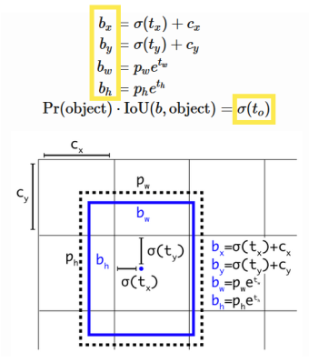 따라서 기존의 YOLOv1이 Object의 중심점을 예측한 것과는 달리 YOLOv2는 예측 Bounding Box의 중심 좌표가 Cell 내에서 벗어나지 않도록 예측 결과인 $t_x$, $t_y$에 sigmoid 함수를 적용하여 offset의 범위를 0에서 1로 제한합니다. Offset 값인 σ($t_x$), σ($t_y$)은 Object의 중심점이 grid의 left top 꼭짓점으로부터 얼만큼 이동하는지를 나타냅니다.
