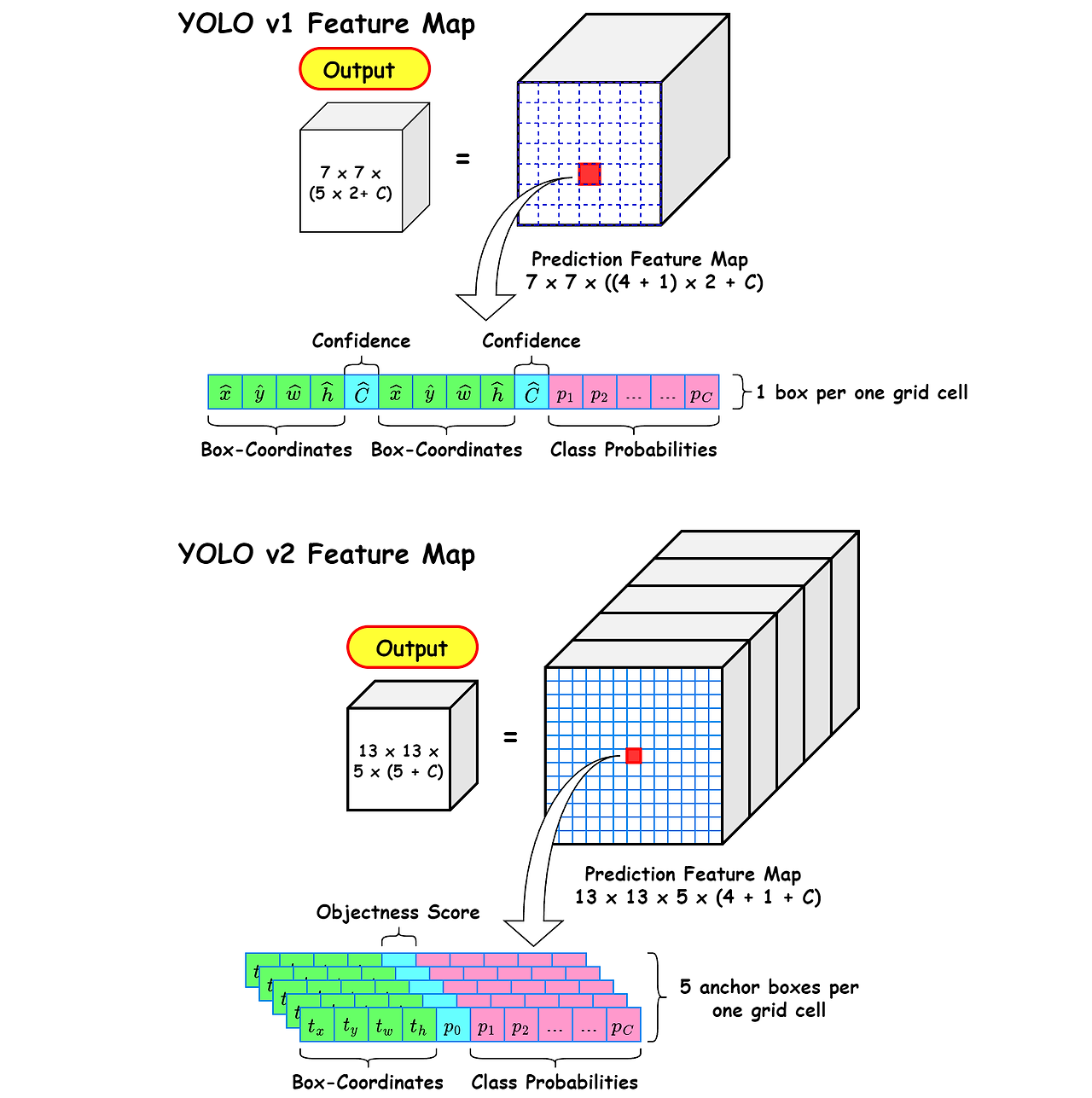 YOLOv1의 경우 7 x 7의 각 grid cell 당 2개의 bounding box를 예측하고 Confidence Score가 더 높은 책임 Bounding Box에 대해서만 Pascal VOC 20개의 클래스 확률을 예측했지만 YOLOv2는 다음 그림과 같이 13 x 13의 각 grid cell 당 5개의 anchor box로 Bounding Box를 예측하고 모든 anchor box에 대해서 20개의 클래스 확률을 예측합니다. 즉 YOLOv2의 경우 출력 feature map의 depth는 125(4(Bounding Box offset) + 1(객체가 있을 확률($P_o$)) + 20(Pascal VOC 각 class 별 확률) = 25 x 5(Anchor box 개수) = 125)가 되고 전체 feature map의 크기는 13 x 13 x 125가 되는 것이죠.