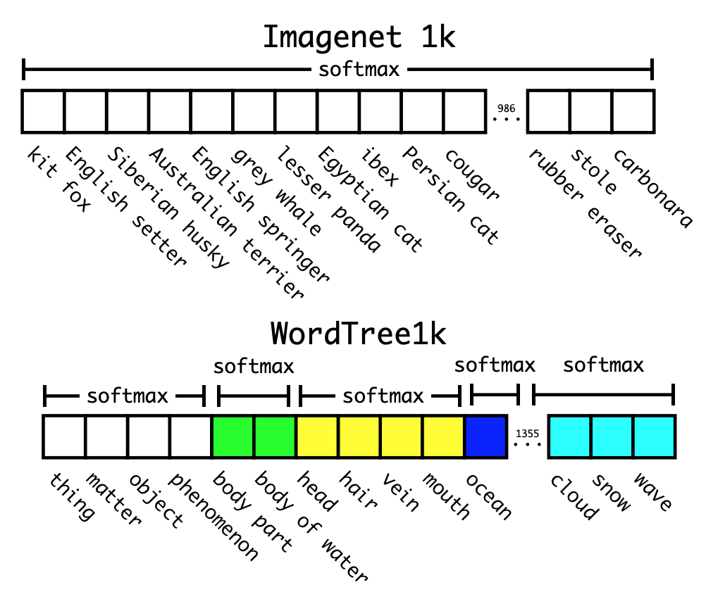 이를 위해서 저자는 계층적인 트리(Hierarchical tree)인 WordTree를 구성하여 COCO dataset과 ImageNet dataset을 합리적인 방법으로 결합하고, Classification을 수행할 때 하나의 큰 softmax를 사용하는 대신에 WordTree 상에서 공동 하위어에 속하는 class끼리만 softmax를 적용함으로써 분류 작업을 수행했다고 합니다.