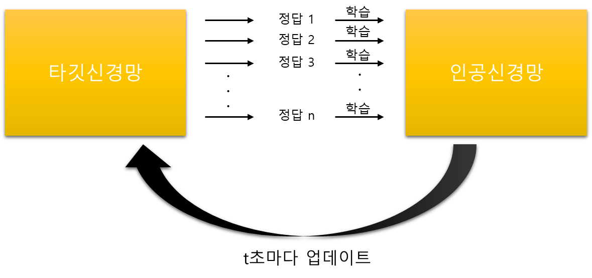 타깃신경망이라는 것을 따로 만들어서 타깃신경망에서 정답에 해당하는 값을 구하고 이 정답을 통해 다른 인공신경망을 학습시키다가 일정한 시간 간격마다 타깃신경망을 인공신경망으로 업데이트해주는 것이죠.