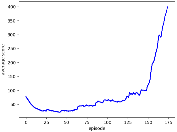 위 그림은 액터-크리틱과 연속적 액터-크리틱을 평균 점수가 400점이 넘을 때까지 실행시킨 것을 에피소드에 따른 평균 점수 그래프로 나타낸 것입니다.