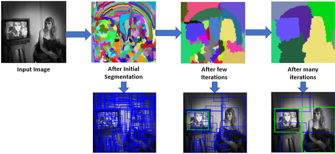 아래 그림과 같이 엄청나게 많았던 초기 영역들이 2번 과정의 반복 횟수가 많아질수록 유사도가 높은 영역들이 합쳐져 후보 영역들이 줄어드는 것을 확인할 수 있습니다.